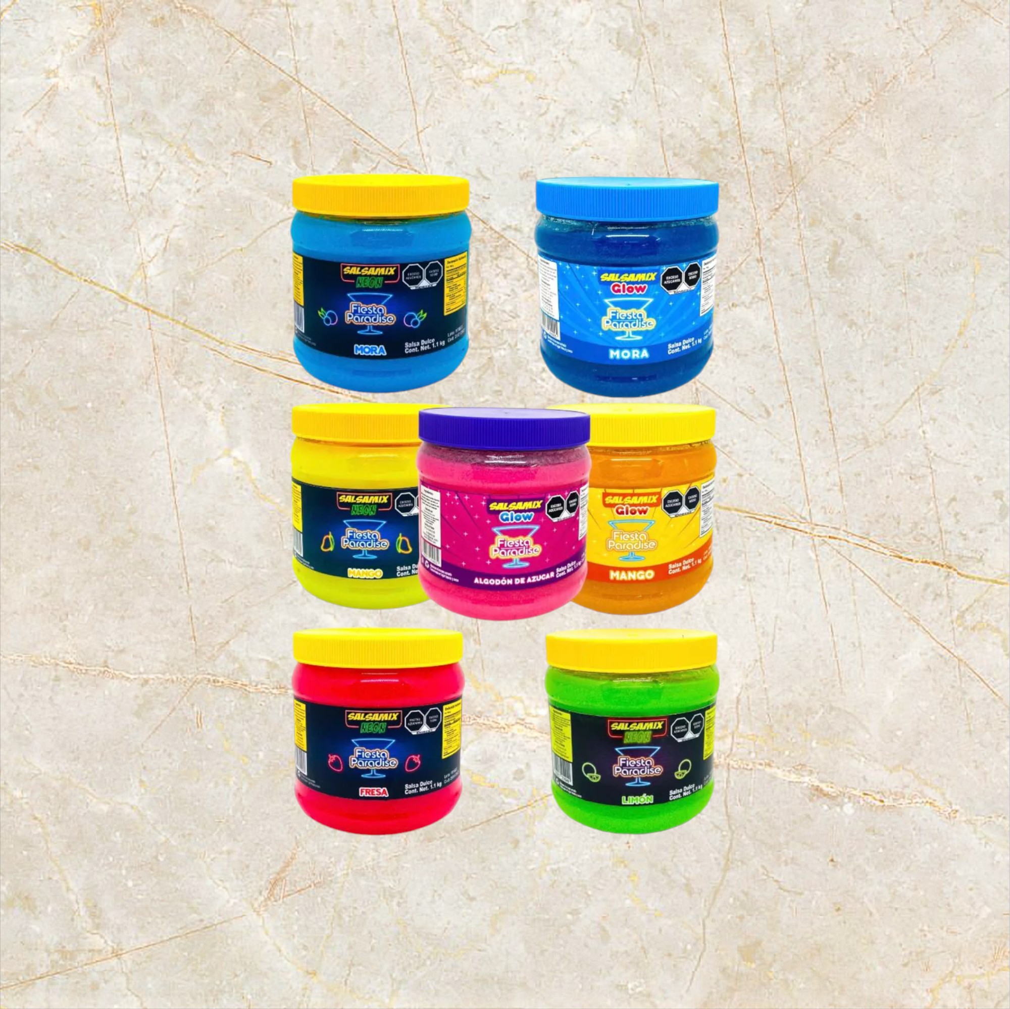 Sabores: Tradicional, Cereza, Chicle Azul, Chamoy, Frutos Rojos, Fresa, Fuego, Mango, Manzana, Pepino, Sandia, Uva