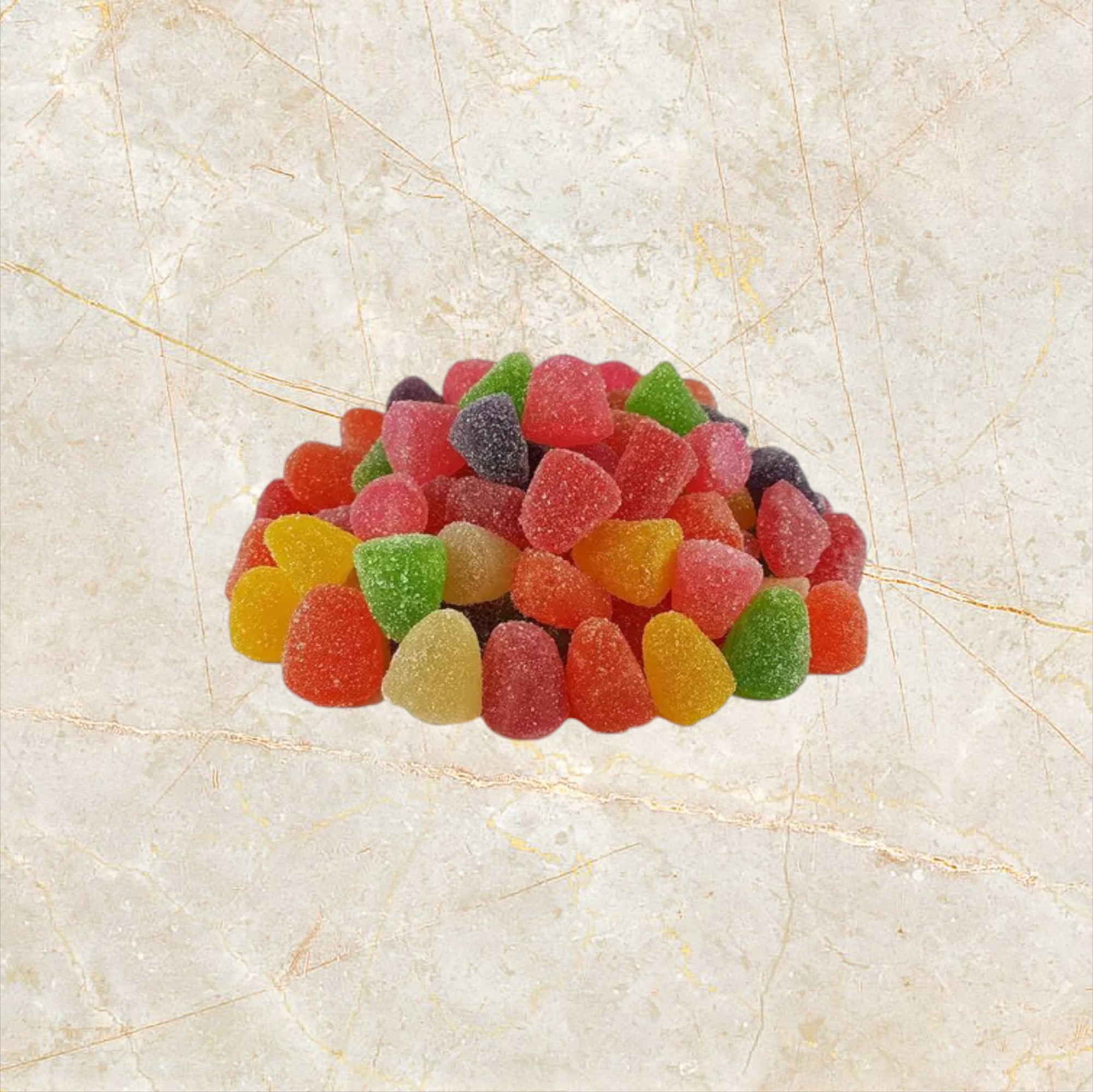 Caramelos masticables muy dulces sabor manzana verde, con cubierta de azúcar en forma circular en colores verde y blanco.