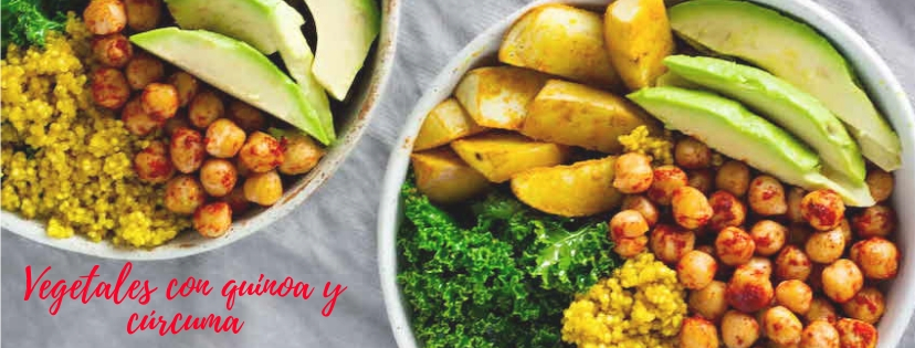 patatas, boniato, zanahoria o calabaza, aprox. 700 gr; 1 lata de garbanzos; 1/4 taza de quinoa; verdura de hojas verde para ensalada, la que os guste; 1 aguacate; 2 cucharaditas de cúrcuma; 1 cucharadita de pimentón dulce; sal y pimienta a gusto; aceite de oliva virgen extra